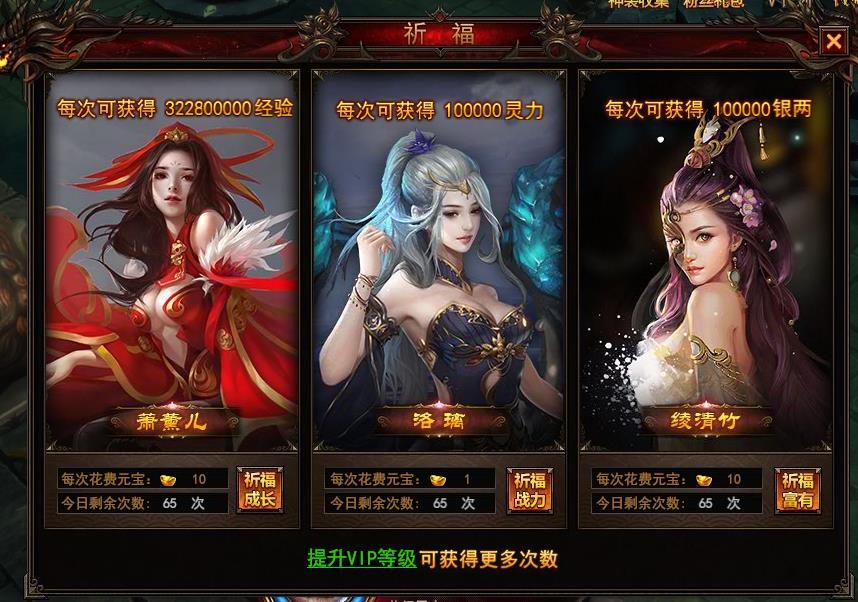 祈福可以消耗少量元宝直接购买大量的经验、真气、银两。每天限次,次数随vip等级进行提升。